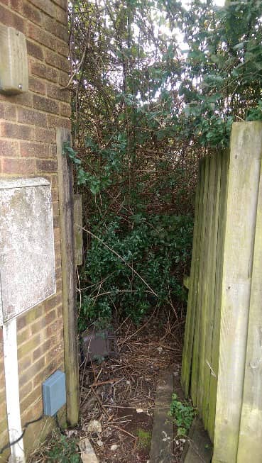 The whole garden was filled with pyracantha and brambles – we could even see an Ash Tree somewhere trying to fight for some light. We couldn’t even get in through the gate (see right).
