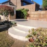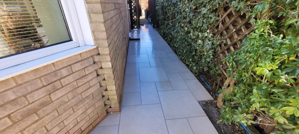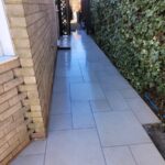 The patio and steps were created using Marshalls Symphony Classic Arrento Cream Porcelain which would lift the area, and we also took the patio along the side entrance of the property so that visitors would get the full effect on entering the garden.